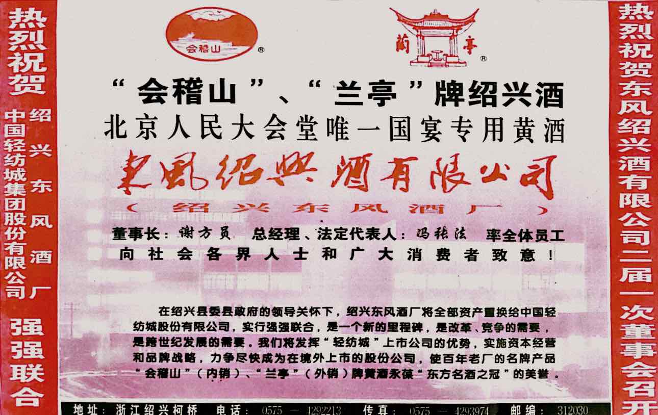 1998年,會(huì)稽山·蘭亭成為人民大會(huì)堂唯一制定黃酒:國(guó)宴用菜一直是淮揚(yáng)菜,這也是當(dāng)年周總理定下來的,主要是考慮到淮揚(yáng)菜口味適中,比較容易被各地、各個(gè)國(guó)家的人接受,而口味適中的淮揚(yáng)菜最適合配較為低度、同樣口感較為適中的黃酒,于是在身為江蘇揚(yáng)州人的江澤民總書記的指定下,會(huì)稽山蘭亭被人民大會(huì)堂指定為國(guó)宴專用黃酒。