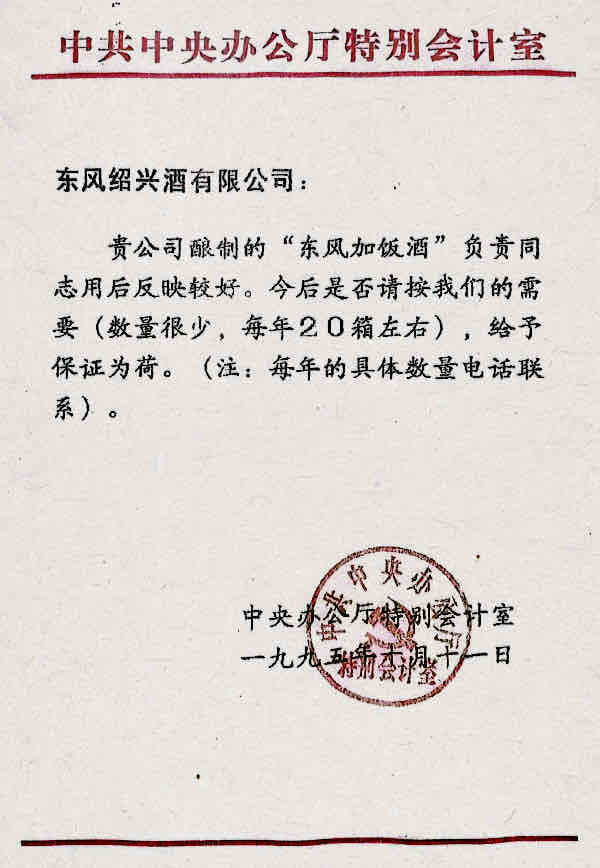 1949年開國(guó)大典晚宴,周恩來總理親筆批示使用紹興黃酒作為開國(guó)用酒:當(dāng)時(shí)茅臺(tái)尚未建廠,還只是赤水河邊的有待整合的若干小作坊。在那個(gè)年代,黃酒比白酒更金貴,各類生活物資尤其是糧食格外緊缺,只有會(huì)稽山前身云集酒廠等極少數(shù)酒廠還能有糯米釀酒,為了表示國(guó)宴的重要性,周恩來特地從紹興緊急調(diào)撥了一批陳年紹興黃酒,這些酒也成了蘭亭酒的“樣品酒”。